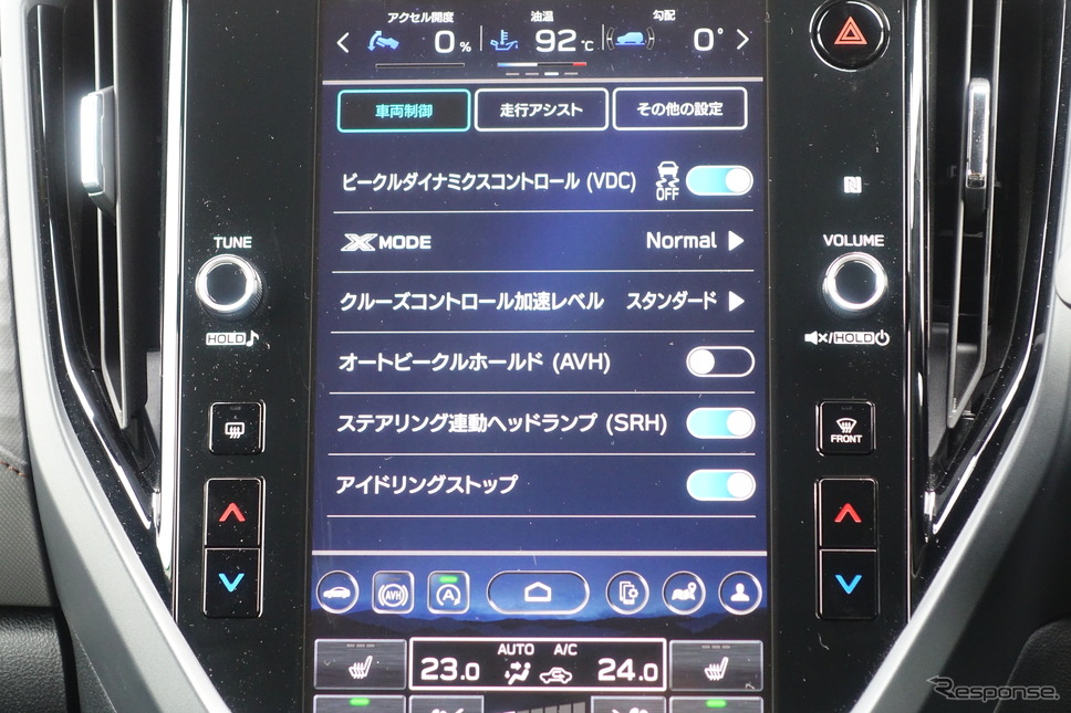 また、いわゆるホールドモード(スバルはAVHという)はデフォルトではオフになり、その操作はディスプレイの中で行わなくてはならない。多くのモデルはホイールドモードの物理スイッチがシフトレバー付近についているのだが、フォレスターの場合はディスプレイから車両設定を呼び出し、AVHをオンにする必要がある。一度でもエンジンを切って止めてしまうとデフォルトに戻るので、不便であった。