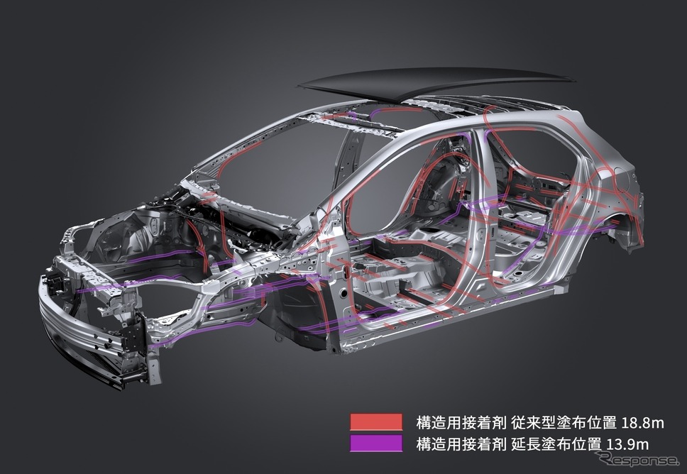 構造用接着剤の延長については、国内サーキットに比べ、強烈な上下左右Gが発生する海外のサーキットでも安定した走行を実現するために、フロントボディ、フロア、リヤホイールハウス付近を中心に、構造用接着剤の塗布量を従来のRZグレード比で+13.9mとなる32.7mに延長した。これにより、質量増加を最小限に抑えながら、より高剛性なボディに仕上げることで、街乗りからサーキットユースまで、あらゆる場面でクルマとドライバーとの一体感を高めた。