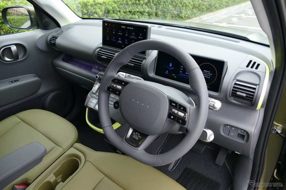 インテリアでは写真のダークグレーカーキが選べる点が特徴。ごらんのとおり、シート表皮のうちのクッション部をカーキとした2トーンで、これは外からは見えないがドアを開けて初めて目に飛び込んでくる驚きのコーディネーションといったところだ。シートバック、センタートレイの黄色の挿し色も専用だ。