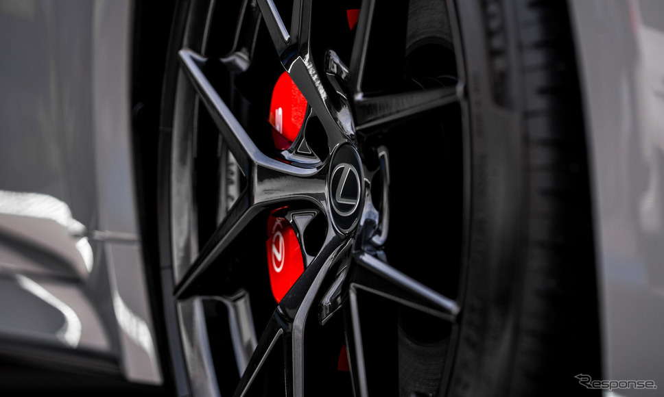 展示車両には新色のウィンドペイントが採用され、F SPORT専用デザインが施される。赤色ブレーキキャリパー、ダークグレー19インチホイール、トリプルビームLEDヘッドライト、新設定のラディアントレッド内装色などが特徴だ。