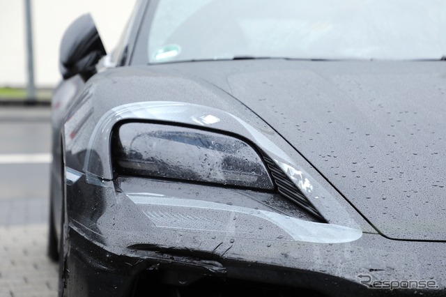 これまで捕捉したプロトタイプでは、リアクォーターウィンドウのラインの形状をフェイクボディと厚手のビニールで隠していたが、ほぼ実物の姿を見ることができたと言える。だが、テスト車両は依然としてフェイククロームトリムで輪郭を覆い隠しており、911を偽装しているかのようだ。