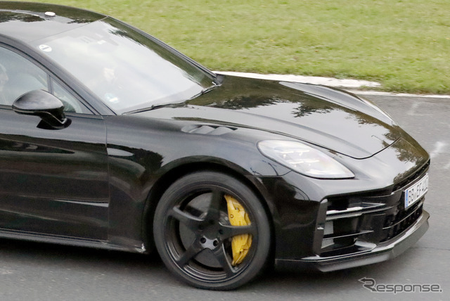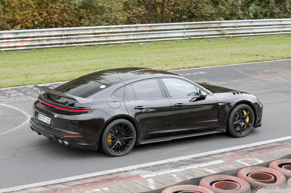 独ニュルブルクリンクで撮影された写真には、ターボGTのあらゆる特徴を備え、さらにそれ以上の精悍なブラックのパナメーラが写っている。大きく口を開けたエアインテーク、巨大なカーボンブレーキ、そして通常のポップアップ式リアウイングの代わりに巨大な固定式リアウイングを装備している。