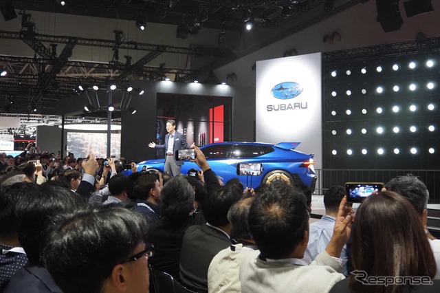 パフォーマンス・シーンを演出する出品は、2台のコンセプトモデル『パフォーマンスE STI』コンセプトと『パフォーマンスB STI』コンセプトで、いずれも世界初公開だ。「スバルの世界観を感じられる車。走りを愉しんでもらえるようにDNAを継承していく」と大崎社長はいう。