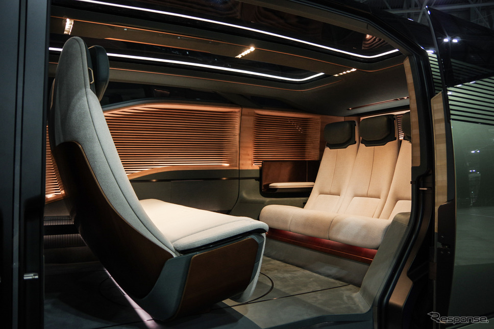 室内空間は広く、3列目でも2列目と同等のスペースを確保。2列目シートは回転することで、向かい合わせに座ることも可能に。次世代のショーファーカーならではの商談スペースに変身する。ウインドウのルーバーやドアパネルに本杢をあしらうことで、安らぎを感じさせつつ高級感のあるインテリアとなっているのも特徴だ。